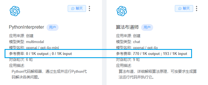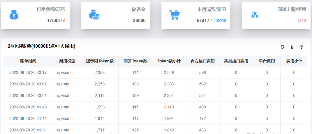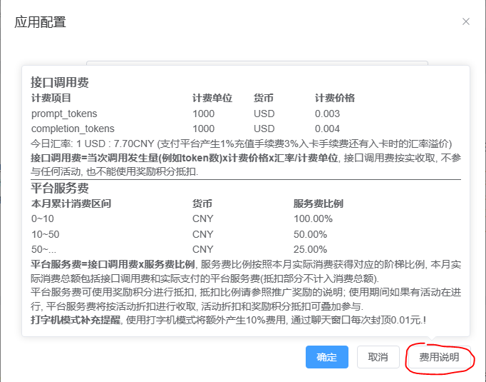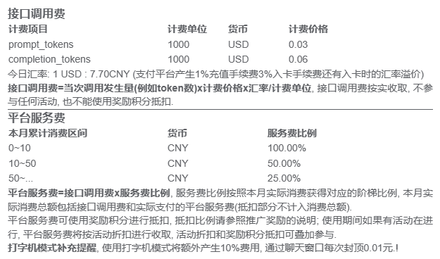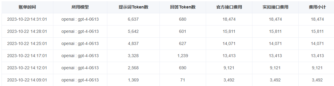 当时的汇率1:7.7,按最近一条(2023-10-22 14:31:01)做样例计算:提示词部分6637(Token)*0.03(千Token费用)*7.7(汇率)/1000=1.533147,保留4位小数,最后向上取整,则提示词将消耗1.5332,回答部分680(Token)*0.06(千Token费用)*7.7(汇率)/1000=0.31416,保留4位小数为0.3142,1.5332+0.3142=1.8474元,计积点18474,目前平台服务费免收。