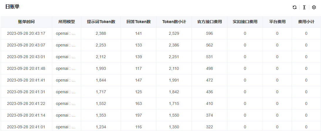 24小时账单里,官方接口费用是按Token计算的接口费用(官方价),因为使用了私域APIkey,所以实扣的接口费用是0,另外私域APIkey免收平台费用,所以在NextERA里并没有产生费用(费用小计为0)。