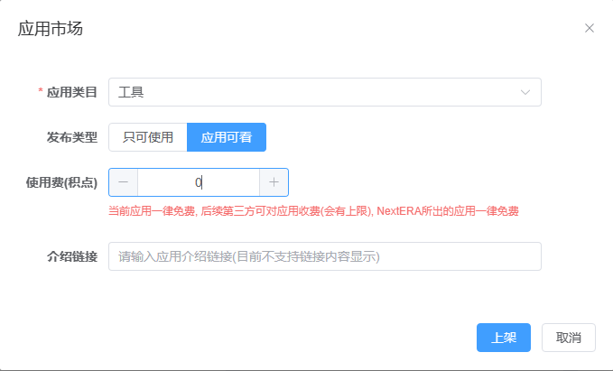 和应用类似,NextERA里的工具也分二类:一类是自己配置的私有工具,通过NextERA的工具机制可以集成您自身的应用;而另一类是从工具市场里订阅。NextERA所发布的工具,使用期间不会产生任何额外费用。