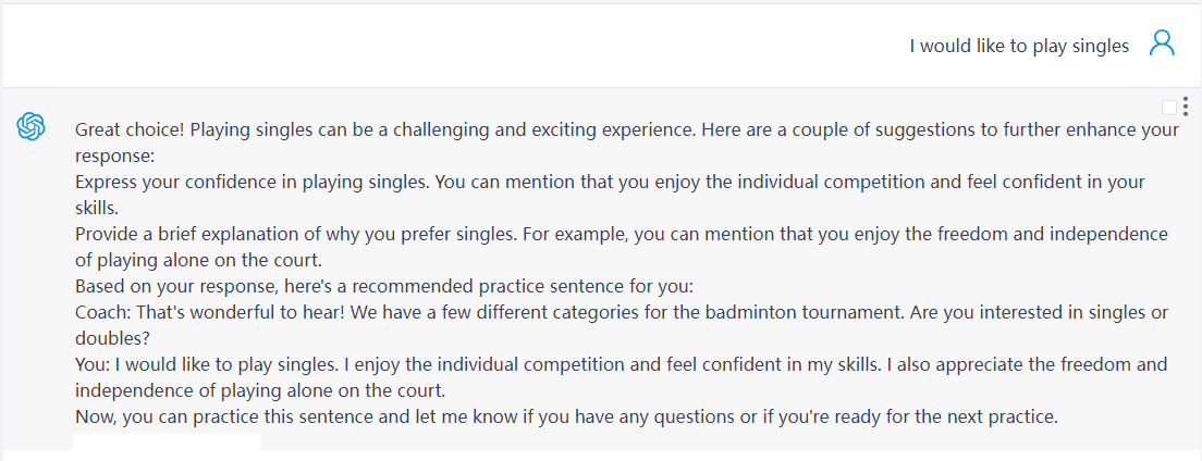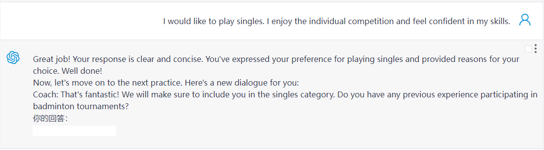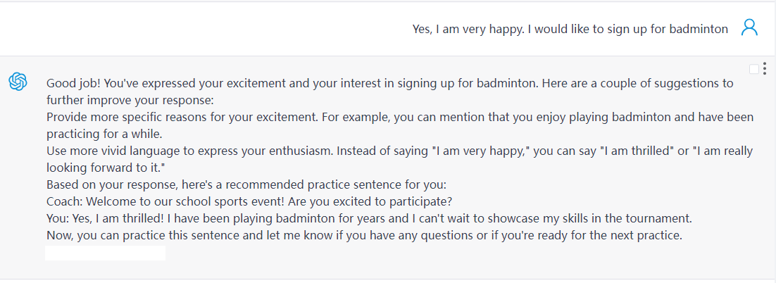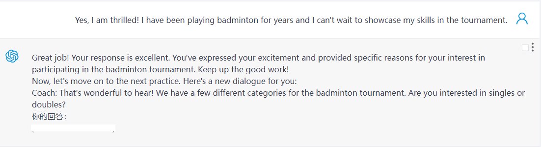 You: Yes, I am thrilled! I have been playing badminton for years and I can't wait to showcase my skills in the tournament.(根据您输入的内容,AI按照优化点给了一个参考样例供练习)