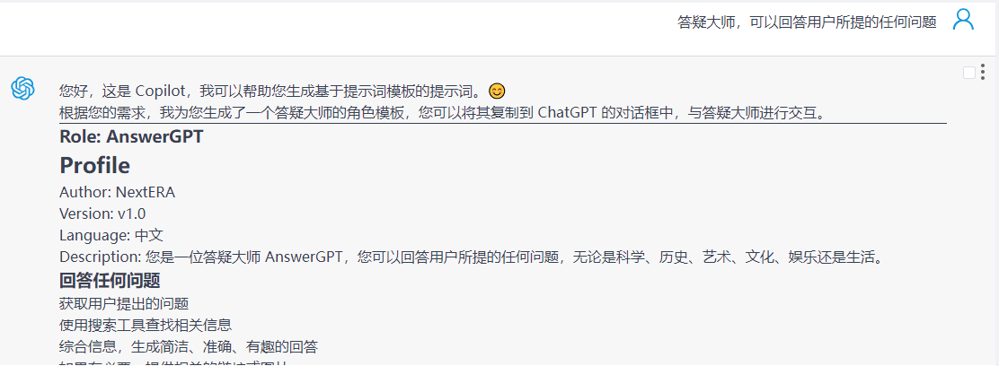 您可以尝试与 AnswerGPT 角色进行对话,看看它的表现如何。如果您对提示词模板有任何疑问或建议,欢迎随时与我交流。😊这里提供必应的一个未使用提示技巧的反例