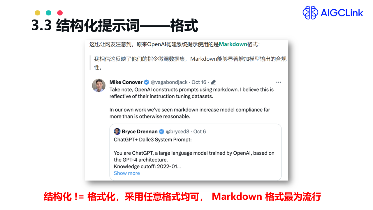 Markdown 确实很好用,我们可以看到 OpenAI 的系统预置词也采用同样方式编写,也是 LangGPT 提示词采用的主要格式。但实际上结构化 != 格式化,可采用任何格式,实践中类似 json,xml 这类具有闭合结构的语法甚至性能更加稳定。