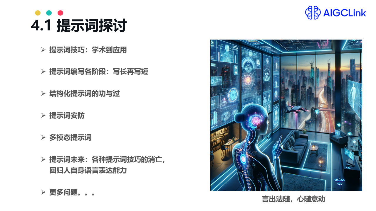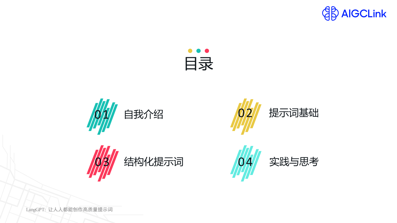 今天的分享分为四个方面内容,自我介绍,提示词基础, LangGPT 结构化提示词,最后是一些实践和思考。