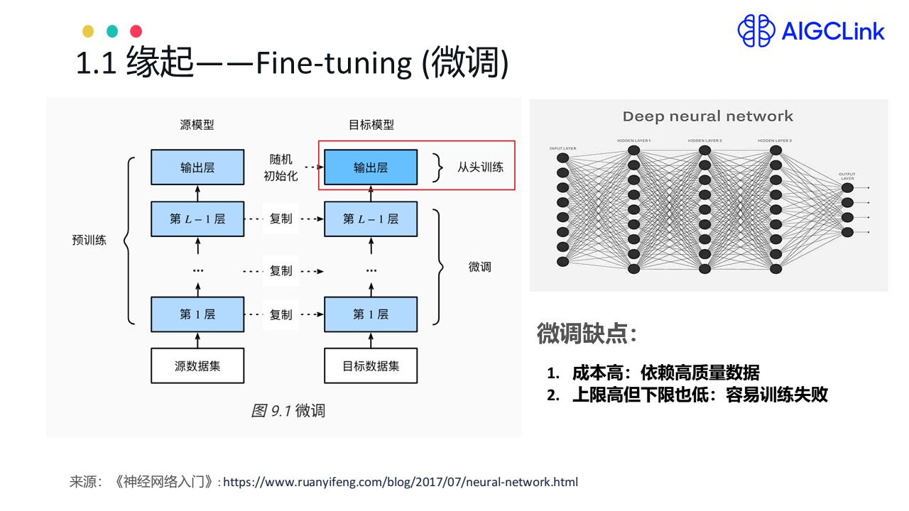 作为一名 AI 算法工程师,22 年之前的许多 AI 应用都是使用的微调完成。先预训练,然后用数据集微调模型的输出层,这是一种通用做法。实际微调多少层,多少参数等等都是可以变化的,甚至可以全参微调。微调有很多好处,缺点也很明显,依赖高质量标注数据,需要调试训练超参数,常常训练失败,甚至性能不如预训练模型。