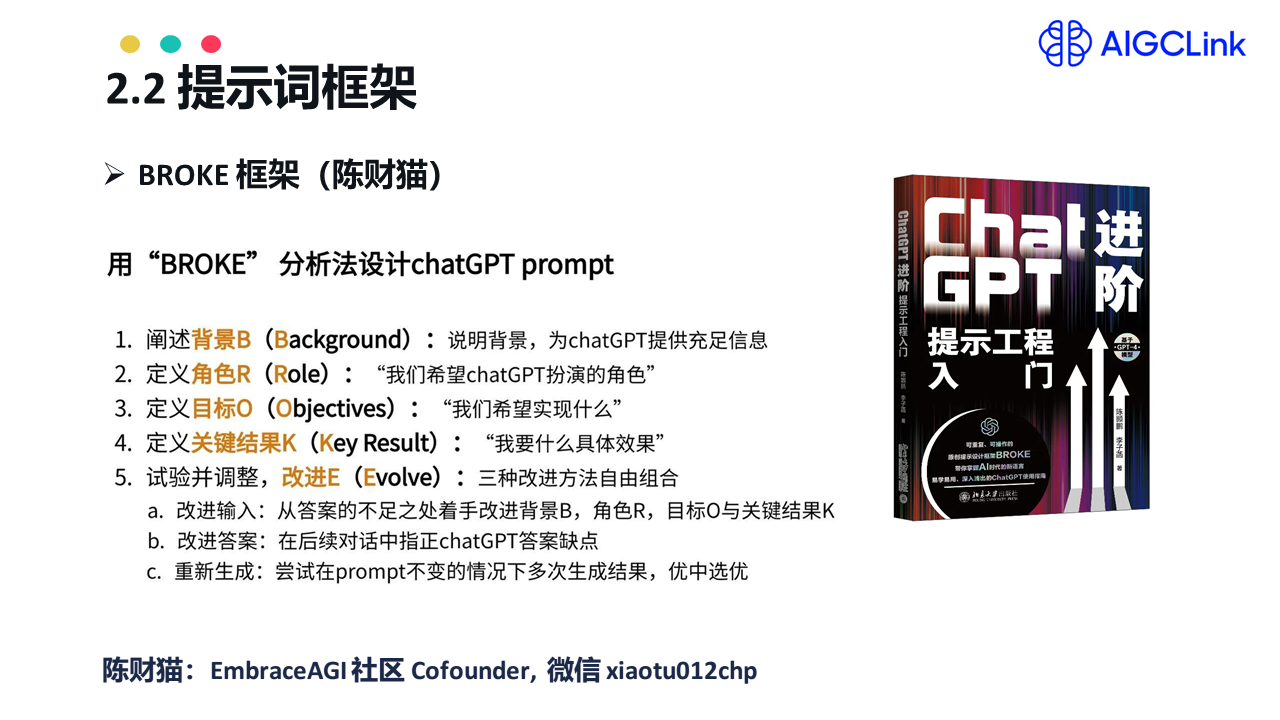 随后出现了各种提示词框架,比如猫总的 BROKE 框架,对编写提示词有了更强的指导作用。猫总还写了提示词进阶这本书,受到了许多媒体的关注和报道,大家感兴趣可以买来看看,下面是猫总的微信,感兴趣可以添加好友交流。